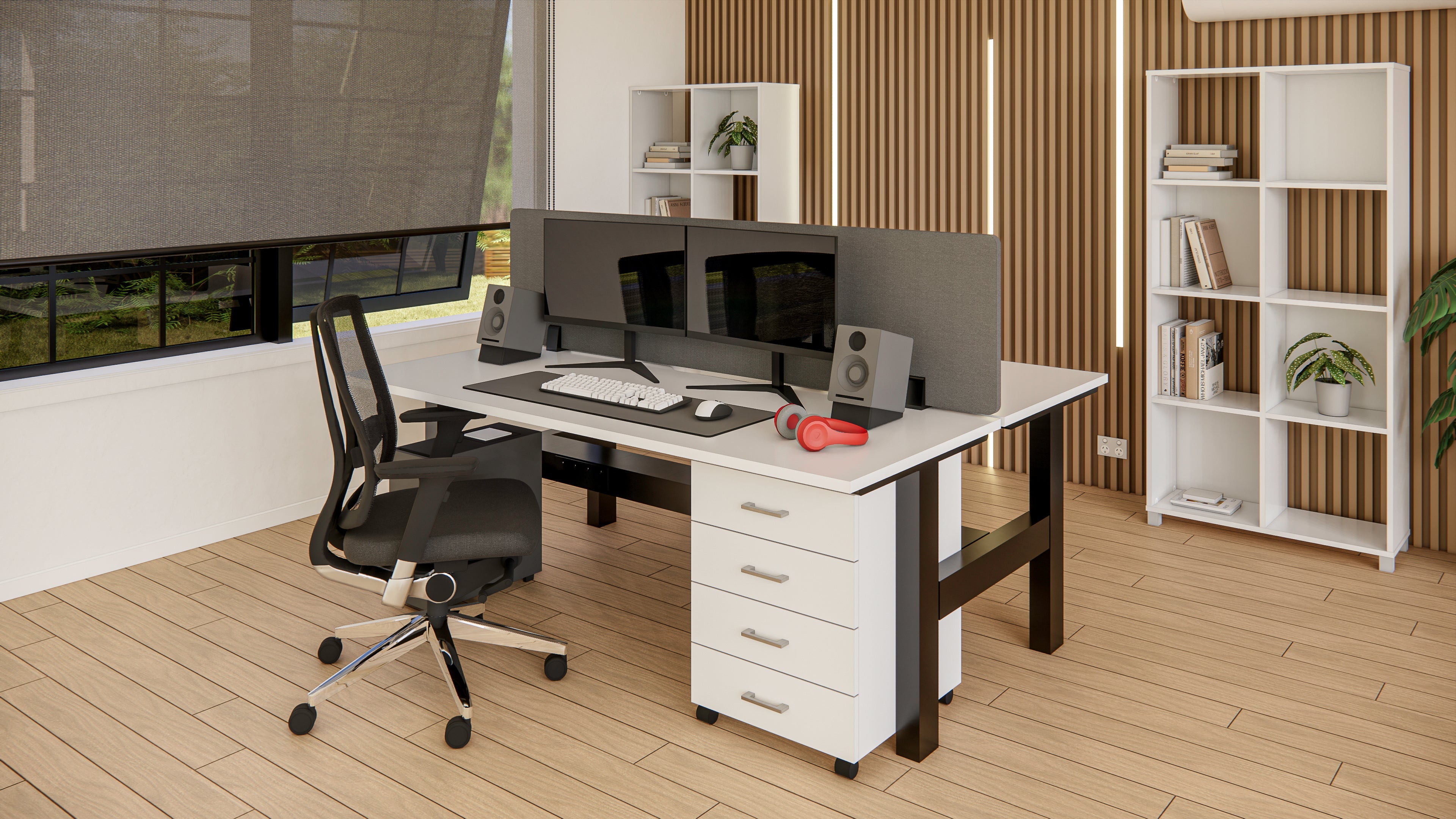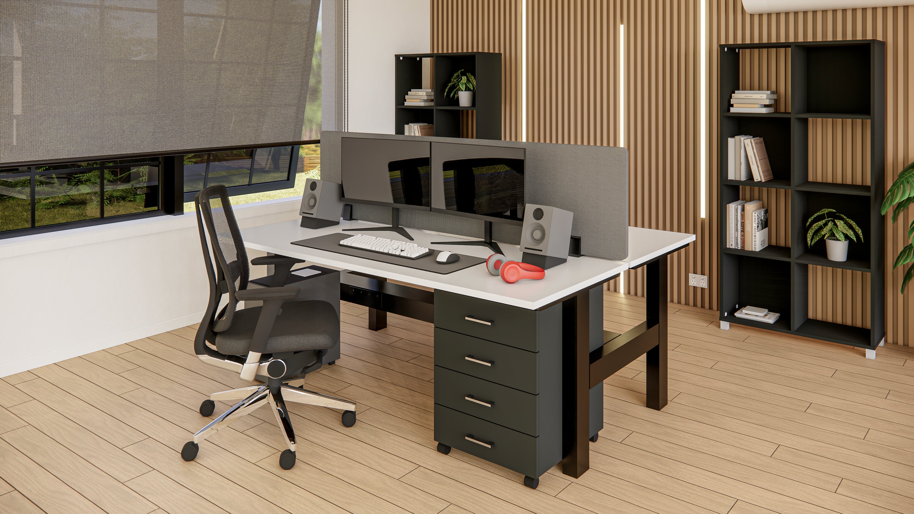 The Alma 2-Person Fixed-Height Pod is the ultimate desking solution for commercial workstations. With its sturdy frame and built-in power rail, it meets all structural requirements and offers endless possibilities for customization. Add center and side screens, desk top power solutions, and other accessories to make your workspace uniquely yours.