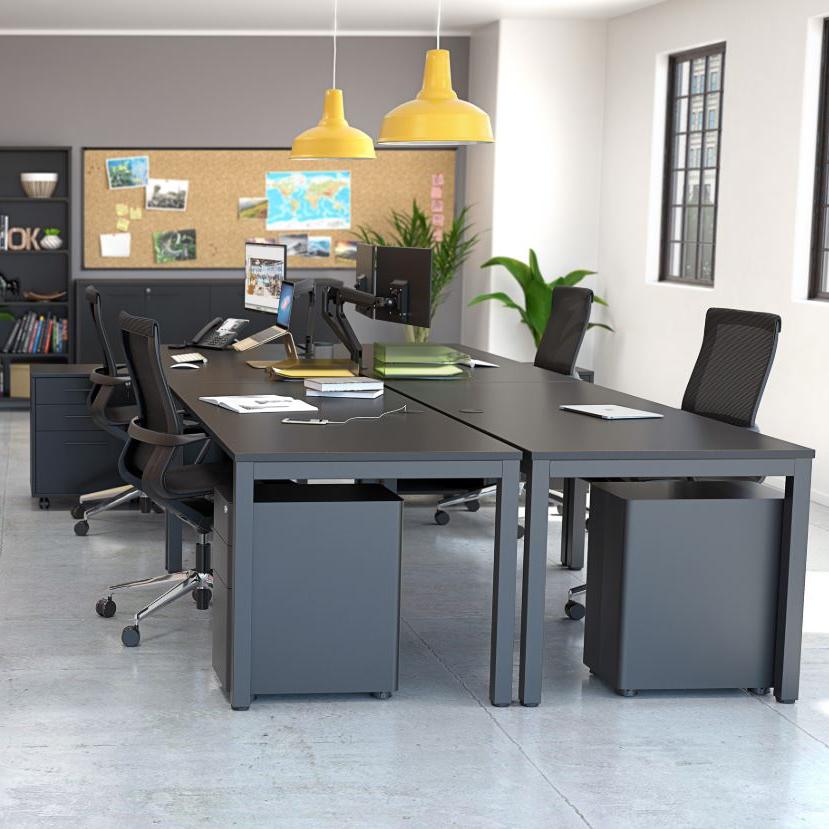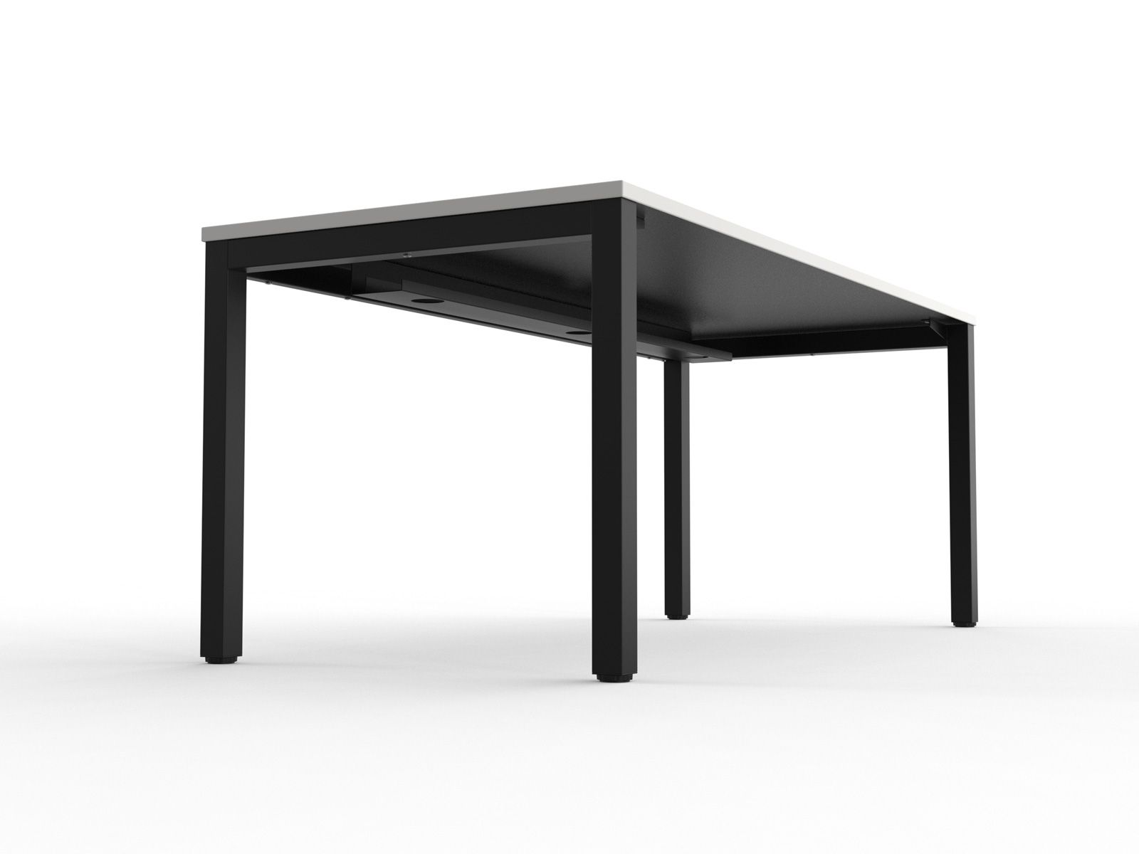 The Cubit desk is built with a 25mm commercial-grade worktop and robust, flush welded steel frames. This desk comes in different sizes, frame colors, and worktop finishes. The 1200 desk does not have a cable port, while the 1500/1800 desks feature a 80mm central cable port.