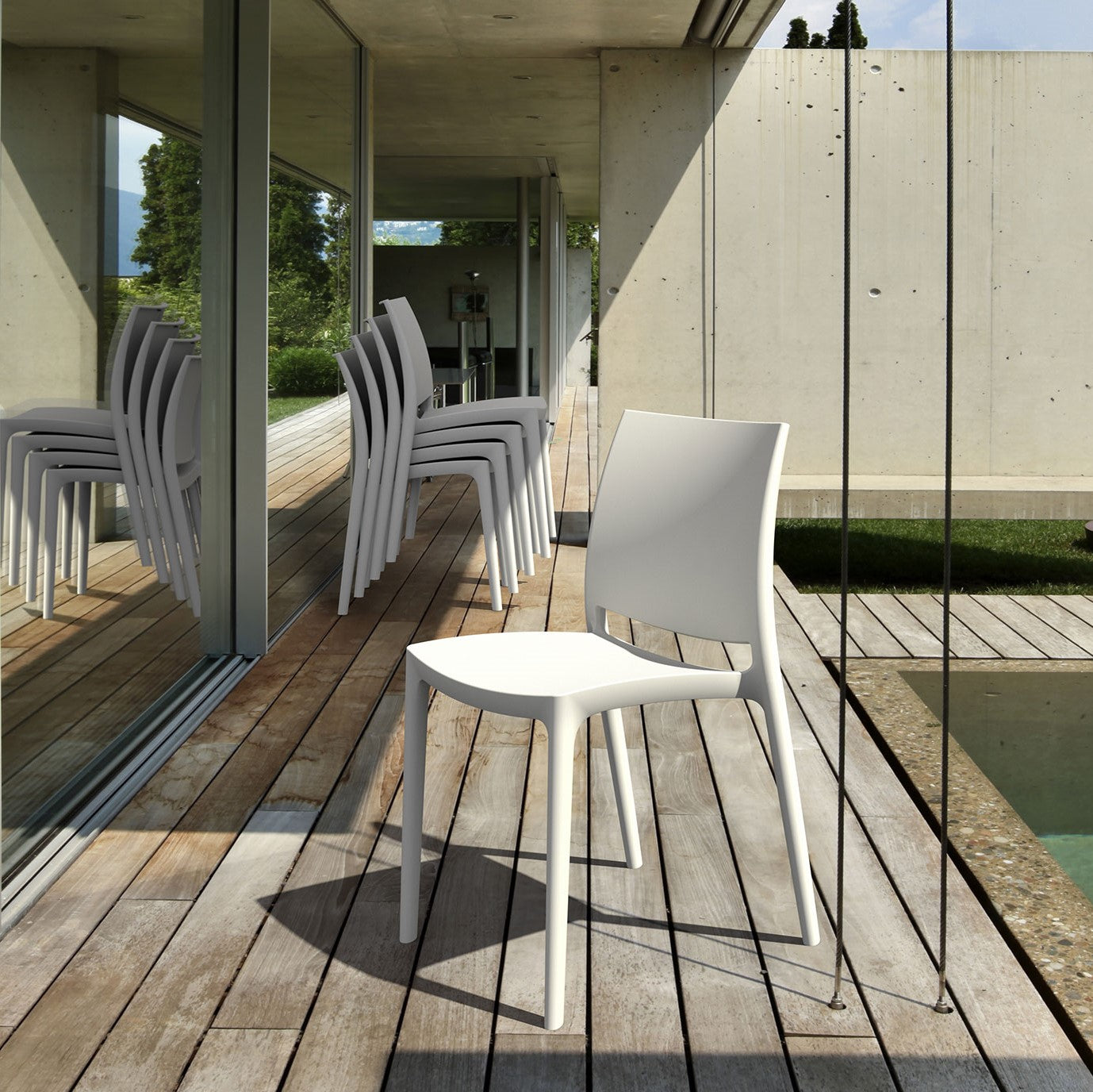 The Maya chair features both neutral as well as bright colour options. It has an informal design which can be used in a range of indoor and outdoor settings. It is easily stackable and comes with glass fiber reinforced polypropylene which allows it to have both a light weight design as well as being commercially weight rated. The material is UV colour resistant which helps with colour fade when exposed to UV rays.