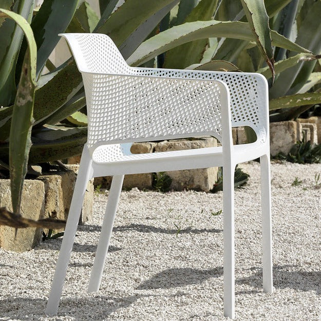 Made and designed in Italy and suitable for both outdoor and indoor spaces. The Net chair is fibre-glass resin infused polycarbonate painstakingly punched with a pattern of square and rounded slots, which adds transparency and lightness to the chairs design.