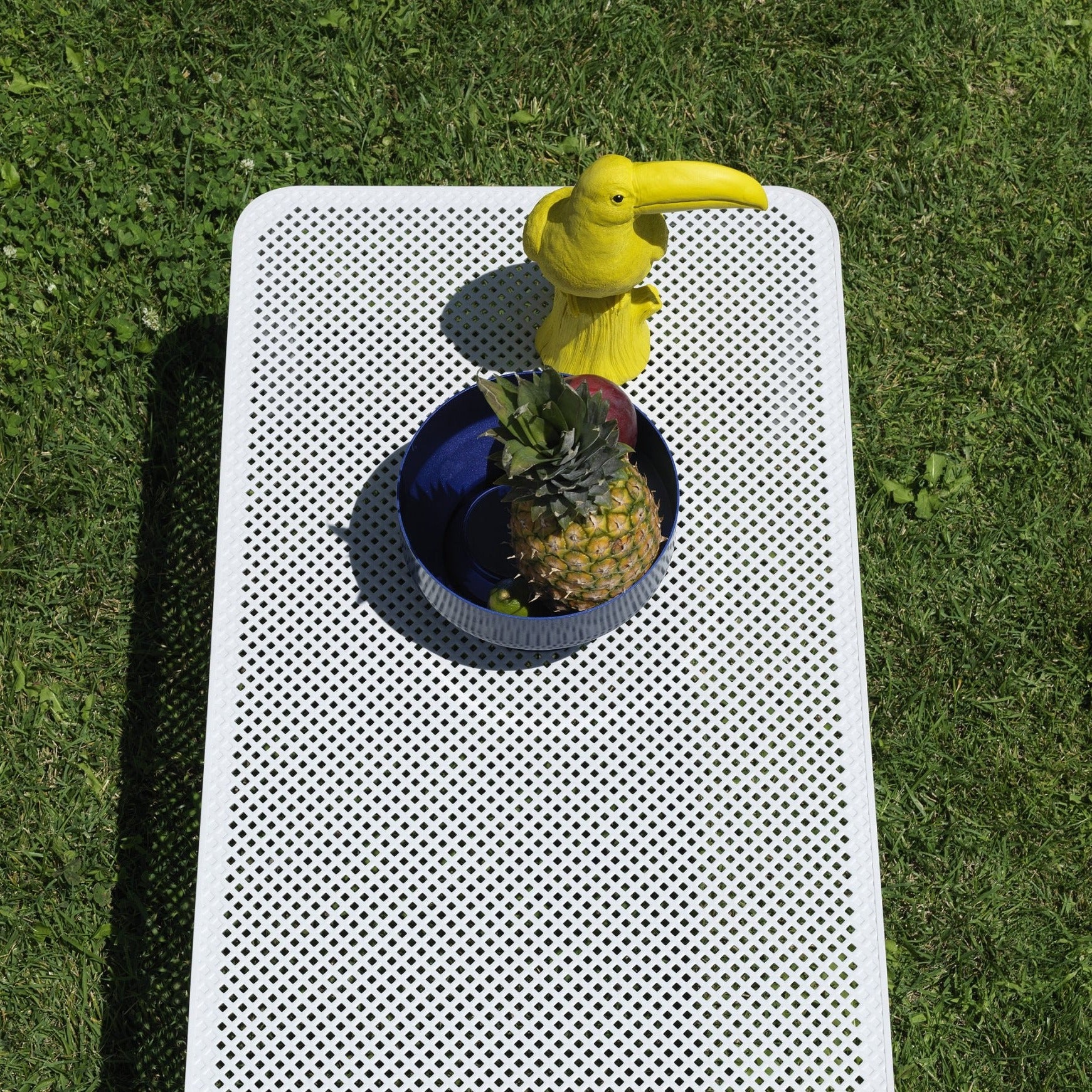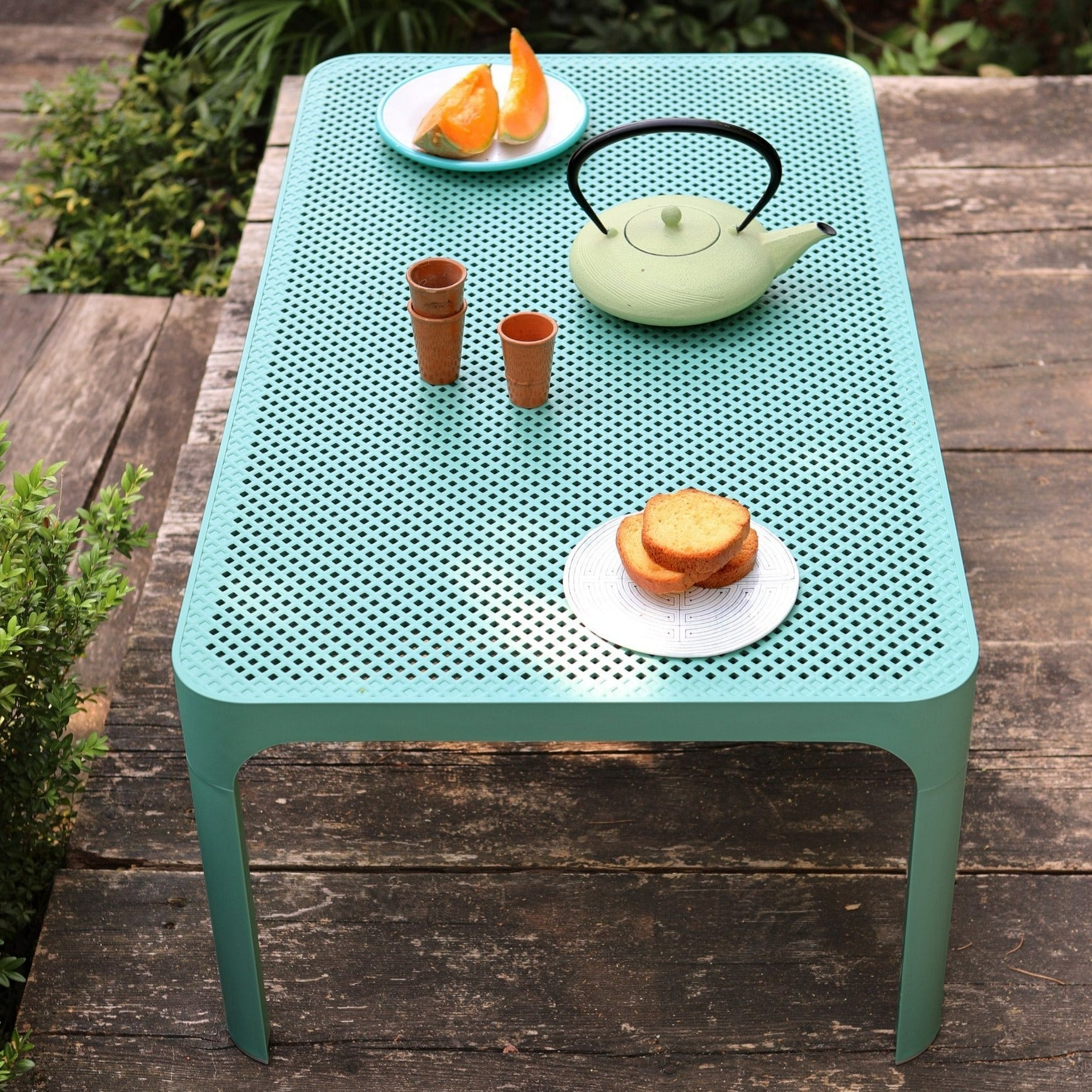 Elegant low table in matt coloured Fibreglass & Polypropylene resin with rectangular top, decorated with the perforated pattern that characterises the whole Net collection. With non-slip feet and Recyclable resin.