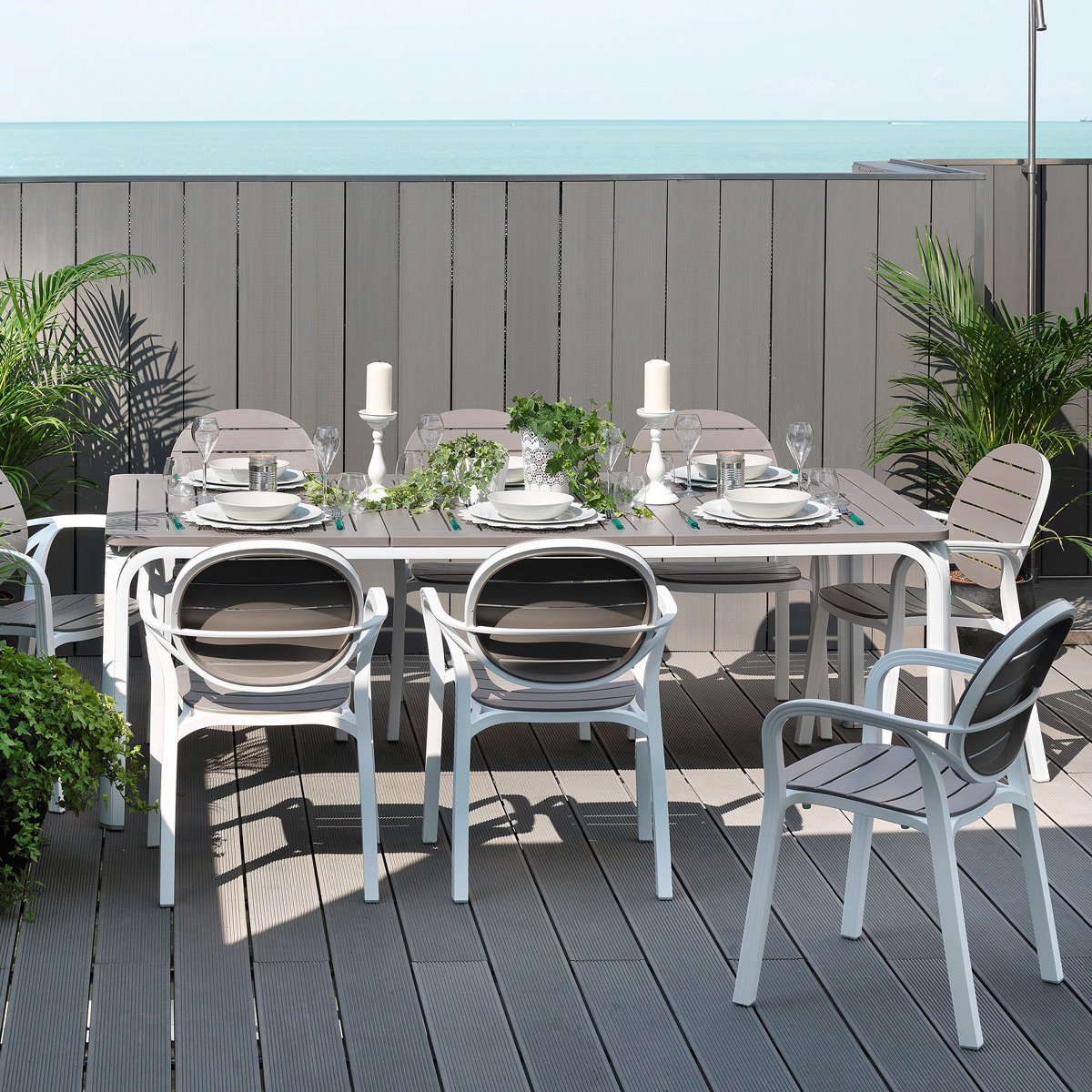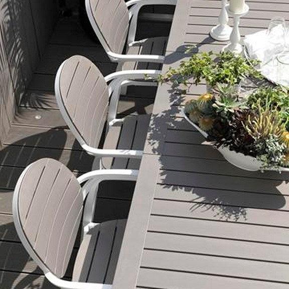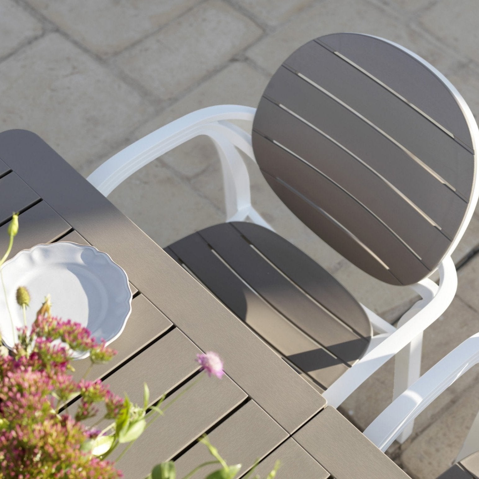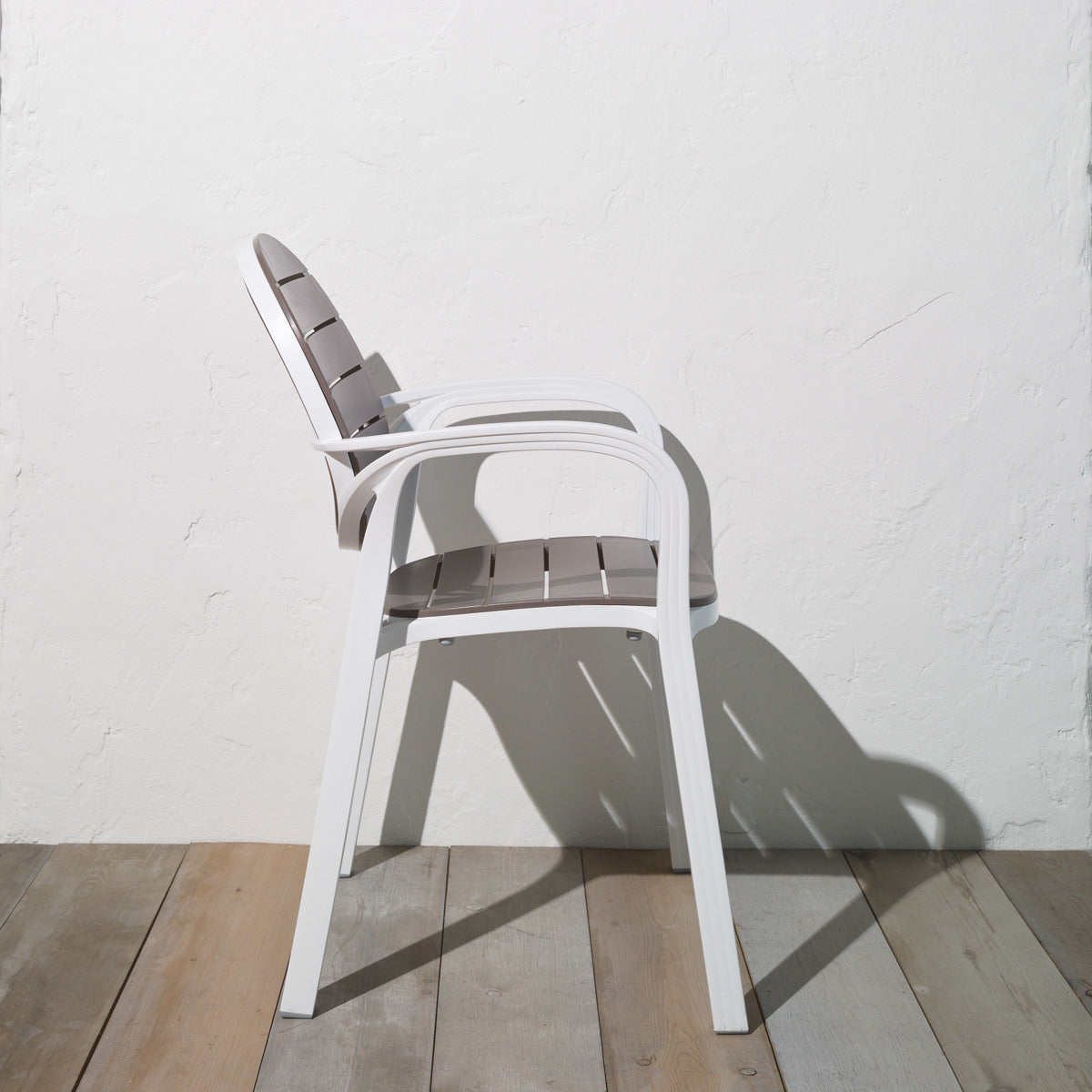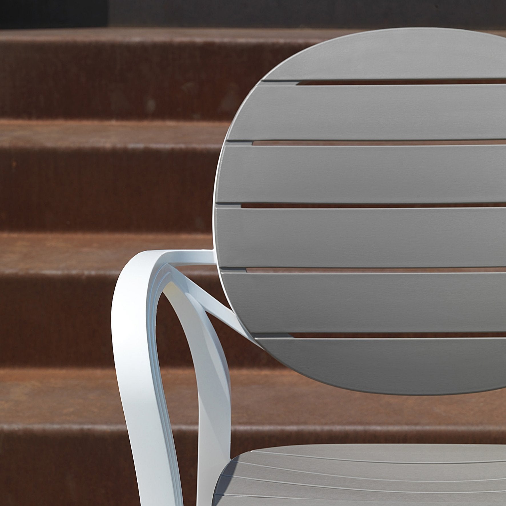 This chair combines contemporary style with practicality. Its large faux timber slats not only add elegance but also provide a comfortable and supportive seat and back. The slim legs and rounded elements make it both sturdy and stylish. Plus, its lightweight and stackable design makes it an ideal seating option for any outdoor space.
