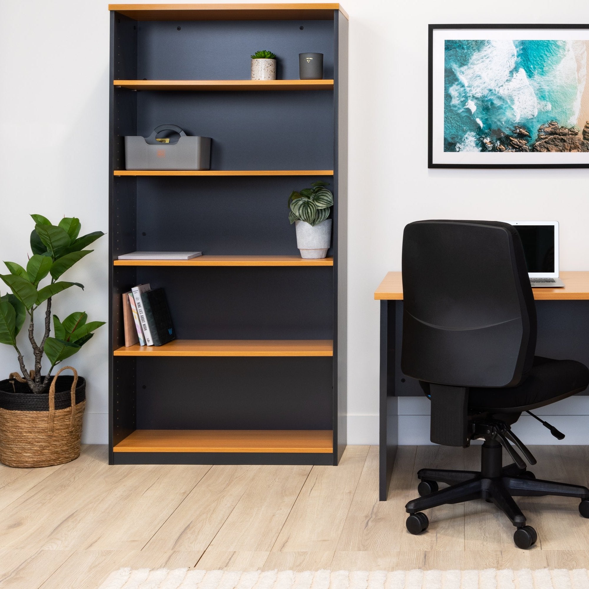 A fantastic storage solution for the home or office, the Quantum Bookcase is strong, sturdy and features 4 shelves to maximise the use of vertical space. It’s classic beech and charcoal design is timeless and simply stunning. With shelves that are deep enough for A4 size folders, this is the perfect bookcase for storing your files, books or decorative items.