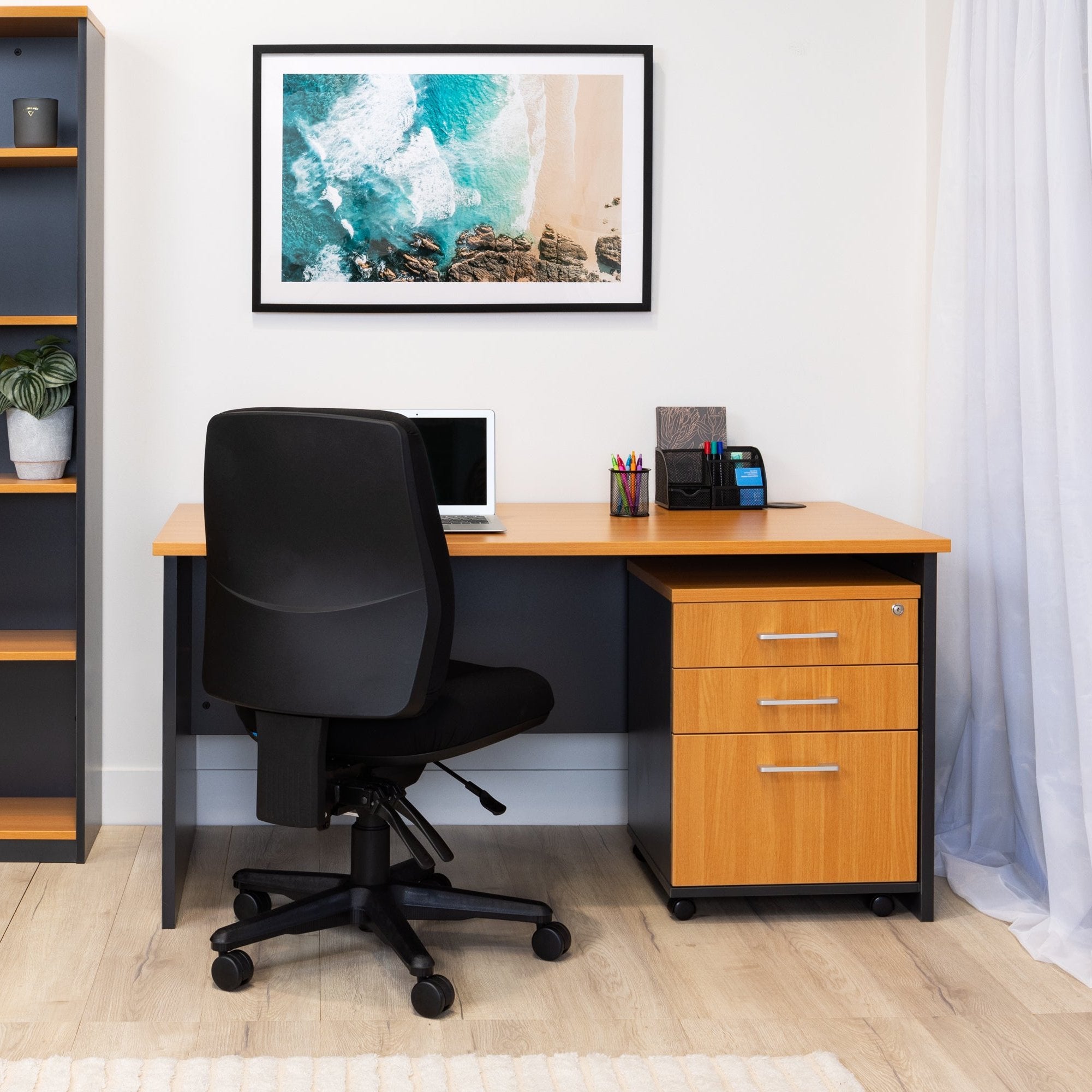 The lockable 3 or 4-drawer Quantum mobile unit is ideal for home or office use as it will help you keep all your documents and other items organised and out of the way. It’s classic beech and charcoal exterior is refined and timeless, the melamine surface makes it scratch-resistant and easy to clean. The top drawers can be used to keep daily office essentials and the bottom file drawer has plenty of space for safely storing your files or technology.